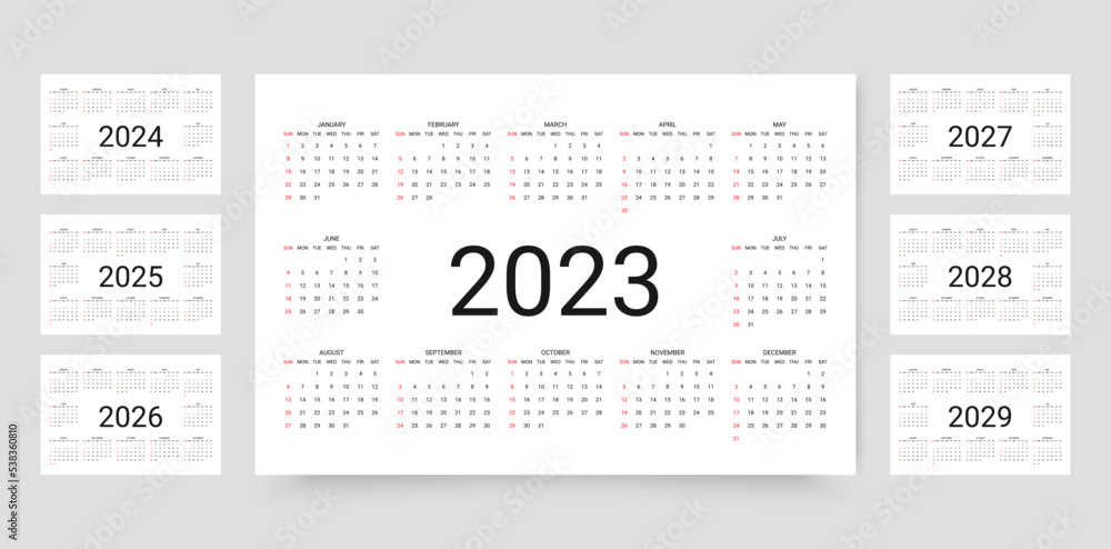 Source : www.yearcalendar.shopVecteur Stock Calendar for 2023, 2024, 2025, 2026, 2027, 2028
